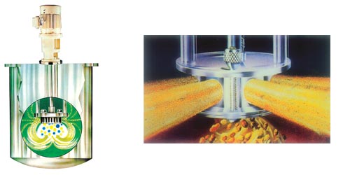承受剧烈的机械及液压力的剪切作用,将颗粒撕裂和粉碎,与此同时新的物料被吸进转子中心,被推出的物料在容器壁面改变方向,从而完成了一个循环。